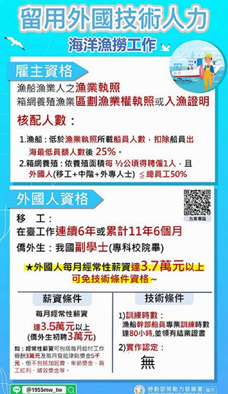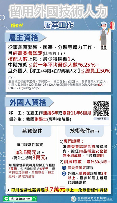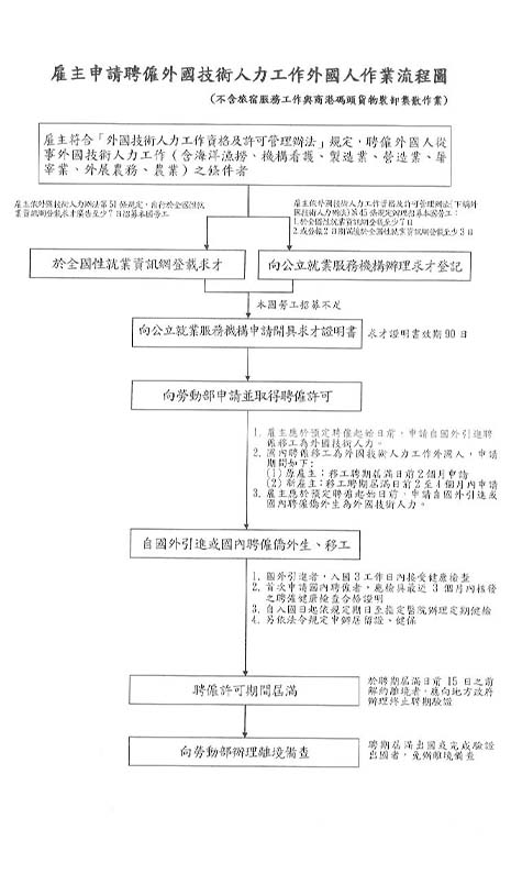雇主符合「外國技術人力工作資格及許可管理辦法」規定,聘僱外國人從 事外國技術人力工作(含海洋漁撈、機構看護、製造業、營造業、屠宰業、外展農務、農業)之條件者。