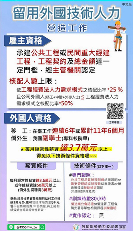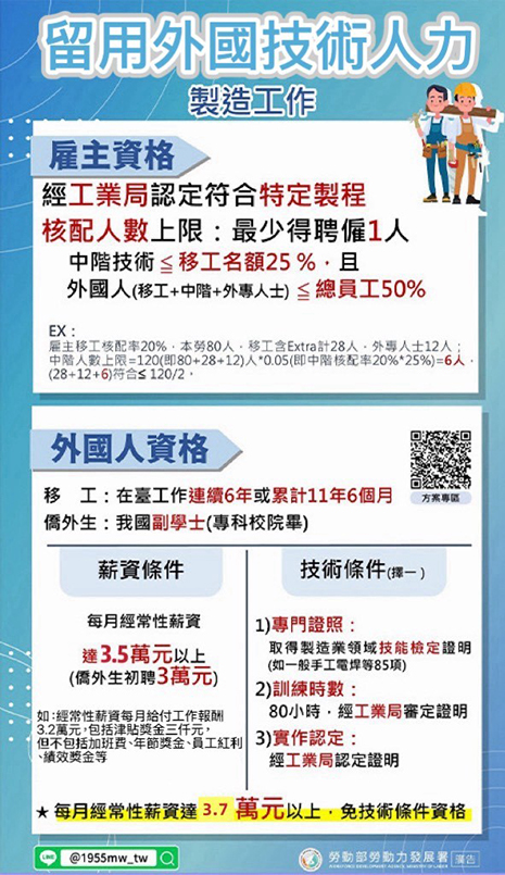註經常性薪資達3.7萬元以上外國人,免技術條件限制。